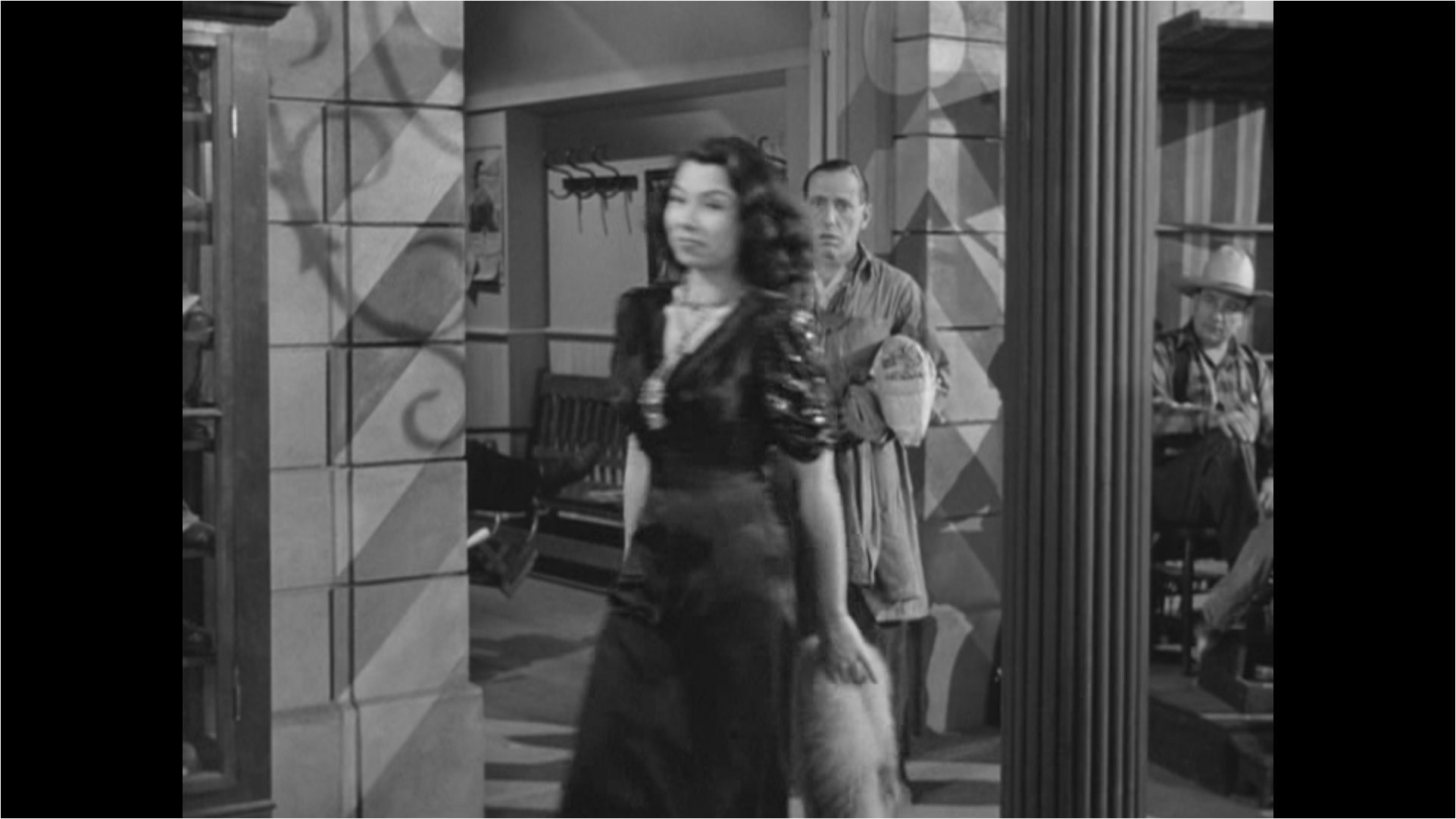 First she approaches and Bogart glances at her.